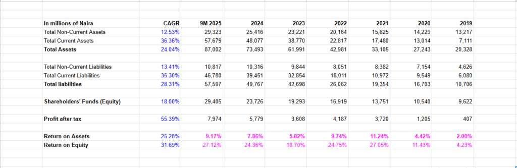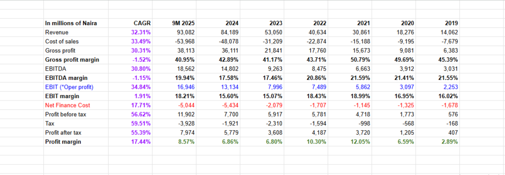 Net profit margin as seen above peaked at 12.05% in 2021 and was 8.57% in 9M 2025. That means that for every N100 in revenue earned in the period, N8.37 was profit.